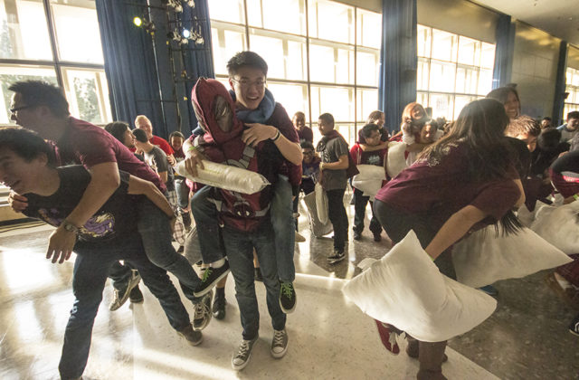 A loud noise boomed throughout Ackerman Grand Ballroom and, on cue, the sea of bystanders attacked each other, pillows in hand. The room transformed into a blur of multicolored onesies, capes, unicorns, Robins and Supermen.