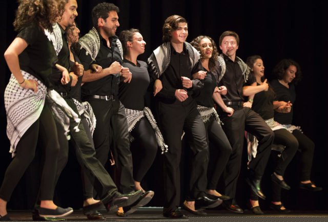 The tone of the performances shifted as the night went on, as the lights dimmed and students dressed in black and wearing the traditional Arab hattah, or headdress, entered the stage.
