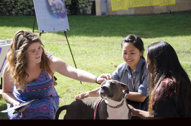 A brown-and-white pitbull named Apple greeted passersby on Bruin Walk Wednesday with slobbery smiles and sloppy kisses as a part of Pet Advocacy Day.