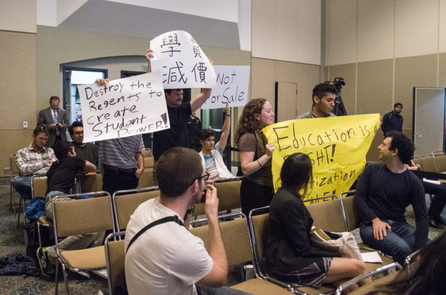 Student protesters disrupted a University of California investments planning meeting Friday at UCLA, calling for divestment from fossil fuel companies and companies some say are involved in human rights violations in the West Bank and Gaza Strip. The students also protested against the UC’s plan to increase tuition.