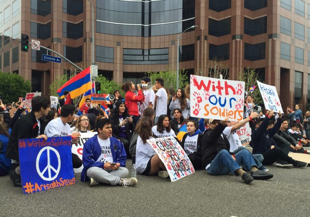 Hundreds of Armenian community members and UCLA students participated in a sit-in Friday at the Consulate General of Azerbaijan’s office to protest recent Azerbaijan violence against the Nagorno-Karabakh Republic, also known as NKR and Artsakh.