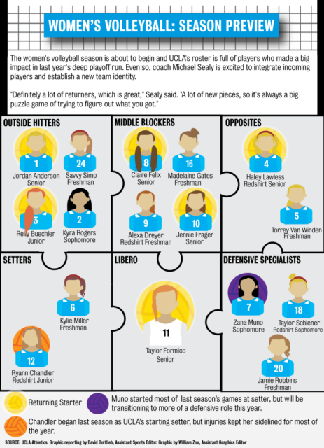 On the offensive side of the ball, Ryann Chandler will look to put her injury struggles from last year behind her as she and freshman setter Kylie Miller run the Bruins’ offense this season.