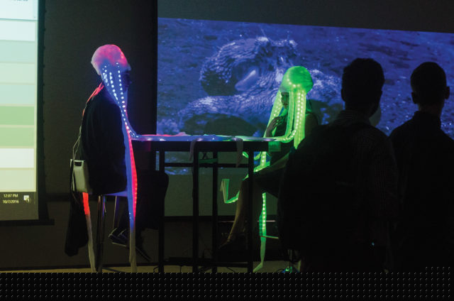 In a separate room, octopus-shaped caps with neural sensors translated brain waves into musical notes and colored lights. The people wearing the caps could see and hear how similar their thinking patterns were.