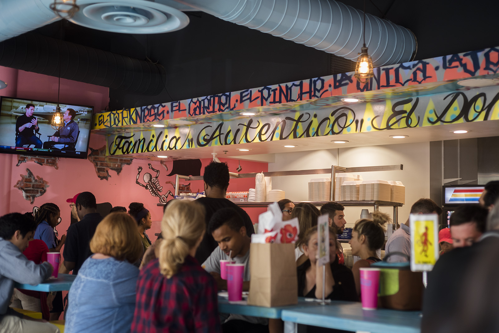Pinches Tacos opened its seventh location in Westwood on Wednesday and gave away free tacos from 12 p.m. to 7 p.m. Customers filled the inside of the pink restaurant, which displayed skeletons wearing hats, graffiti art and painted brick patches. Miguel Anaya runs Pinches Tacos with his brother Jorge Anaya. Miguel Anaya said each tortilla was handmade inside the restaurant by family members.
