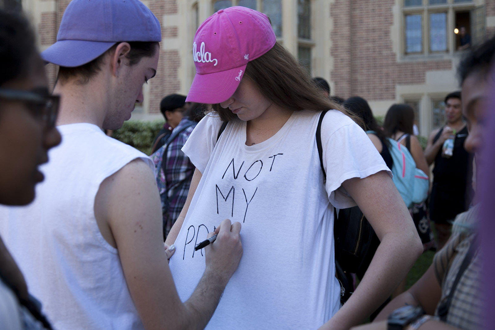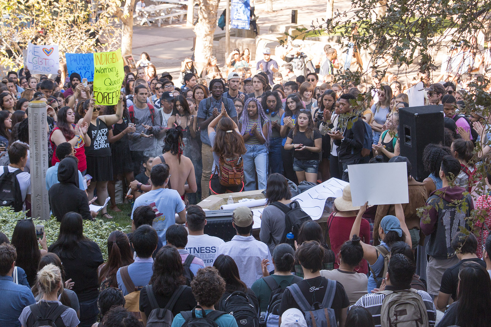 More than 500 students marched up Bruin Walk after assembling in front of Kerckhoff Hall at 11 a.m. The protesters passed Powell Library and Dodd Hall and walked to the Court of Sciences at about 12:40 p.m. before reconvening at Kerckhoff Hall at 1 p.m.