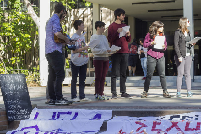 Members of Bruins Against Sexual Harassment organized an open-mic and singing action in front of Young Research Library on Wednesday morning to protest Gabriel Piterberg, a history professor accused of sexually harassing two graduate students. BASH has held protests and actions inside and outside of Piterberg’s classroom, calling for his immediate removal from the university and a replacement for his two winter quarter classes. In an interview with the Daily Bruin Editorial Board, Vice Chancellor for Equity, Diversity and Inclusion Jerry Kang said a 2014 settlement between UCLA and Piterberg limits actions the university can take.