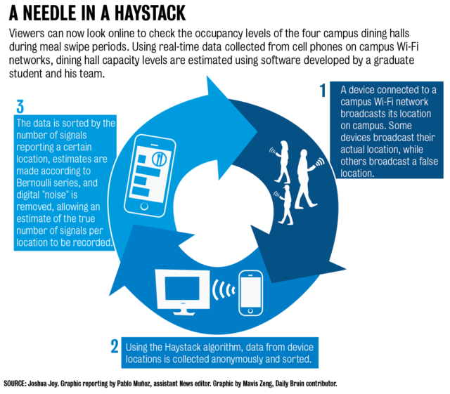 The new software system, called Haystack, was developed as a research project by computer science graduate student Joshua Joy. The software on the Dining website went live May 12 and combines historical visitor data with records of connection attempts to Wi-Fi access points to measure activity levels in designated areas.
