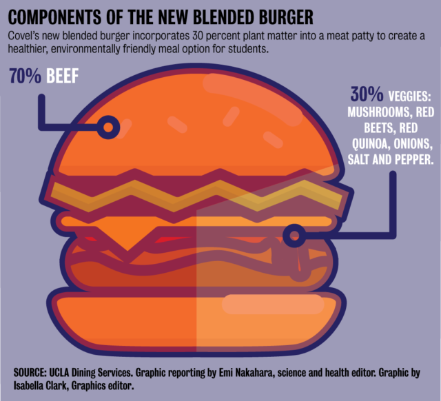 The Covel dining hall introduced the blended burger patty for Covel’s signature UCLA burger Monday. The burger patty is made up of 70 percent ground beef and 30 percent plant matter, including red beets, red quinoa, onion and mushroom.