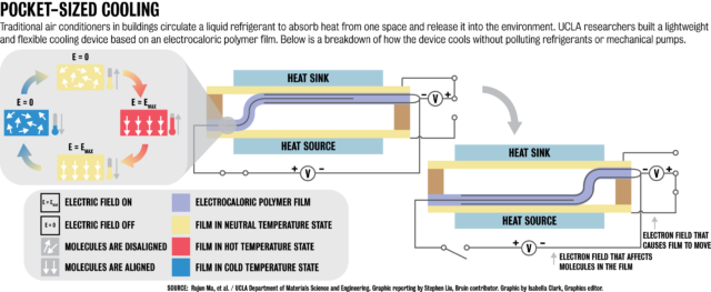 In contrast, the cooling device the UCLA engineers built does not use refrigerants or mechanical pumps, Ju said. It uses a thin film that changes temperature in an electric field, a phenomenon called the electrocaloric effect. This technology has the potential to be more efficient than existing heat pumps, he added.