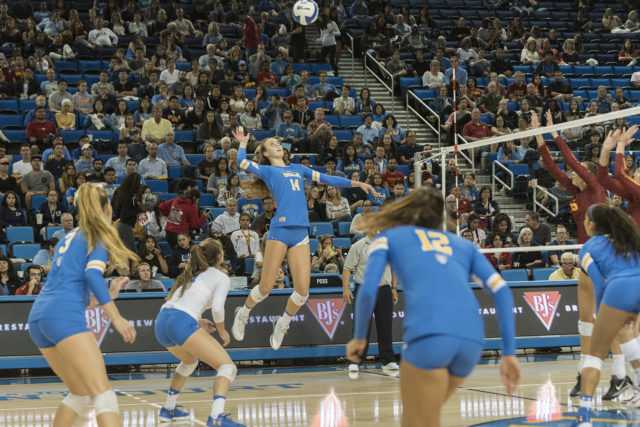 UCLA’s strong passing led senior setter Sarah Sponcil to create an effective offense. Senior pin hitter Reily Buechler and sophomore middle blocker Madeleine Gates led the team with four kills each in the first set.