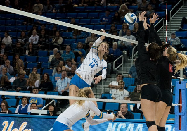 The Bruins had a balanced attack, hitting .324 on the match with five players posting six or more kills, led by Buechler with 13 kills and a .393 hitting percentage.
