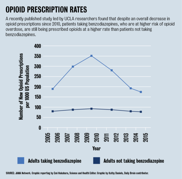 Researchers at the Ronald Reagan UCLA Medical Center and in other departments compared the rates of initial opioid prescription, or prescriptions made to patients who had never been given opioids before, between patients that had already been prescribed benzodiazepines and those that reported they were not concurrently taking benzodiazepines. The researchers found that, from 2005 to 2010, the number of initial opioid prescriptions for benzodiazepines users increased from 189 to 351 per 1,000 individuals versus a smaller increase from 78 to 93 per 1,000 individuals for non-benzodiazepine users. The study did not specify why benzodiazepine users were prescribed opioids more often than other patients.