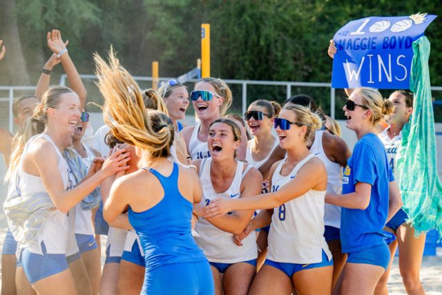 UCLA beach volleyball celebrates on the sand after the court one pairing of senior Maggie Boyd and sophomore Sally Perez win a match. The squad has dropped just three games this year through 21 games in 2026. (Leydi Cris Cobo Cordon/Daily Bruin senior staff)