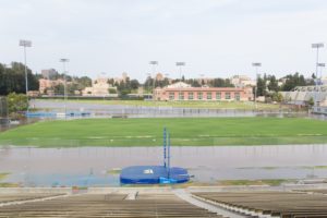 Photo: Tuesday’s flood damaged many of UCLA’s athletic facilities, including Drake Stadium. (Jessica Zhou/Daily Bruin)
