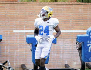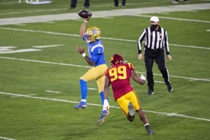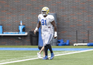 Photo: Junior linebacker Carl Jones Jr. is one of many defensive upperclassmen for UCLA football, which returns a starter at each position. Jones played in all 19 games over the last two years with the Bruins and finished 10th on the team with 21 tackles in 2020. (Andy Bao/Daily Bruin staff)