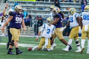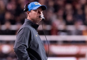 Photo: Coach Jim Mora has seen the impact of concussions on his team this year. In addition to junior quarterback Josh Rosen’s concussion keeping him from traveling to Utah, Mora saw one of his most highly touted recruits quit because of multiple concussions. (Hannah Burnett/Assistant Photo editor)