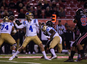 Photo: Redshirt freshman quarterback Ethan Garbers started in place of senior quarterback Dorian Thompson-Robinson in Salt Lake City, throwing for 265 yards and two touchdowns in a losing effort. (Jeremy Chen/Daily Bruin staff)