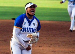 Photo: Redshirt senior pitcher Rachel Garcia gave up five earned runs in 5 2/3 innings against No. 3 seed Alabama. Her opponent in the circle, Crimson Tide pitcher Montana Fouts, got the better of her, throwing a perfect game and picking up the win. (Christine Kao/Daily Bruin staff)