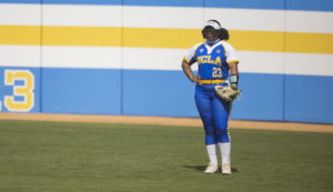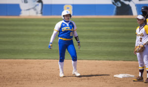 Photo: Redshirt freshman catcher/first baseman Alyssa Garcia picked up a pair of hits in No. 2 UCLA softball’s win, going 2-for-3 while also scoring a run Sunday. (Christine Kao/Daily Bruin staff)