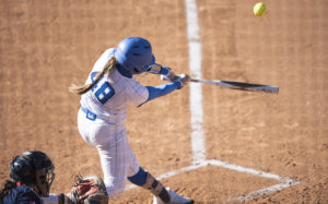 Photo: Starting in both games of the doubleheader Friday, redshirt sophomore outfielder Kelli Godin went 2-for-5 on the day, contributing one run and two RBIs – including the walk-off home run in the second game – to help No. 3 UCLA softball win two straight games against UNLV. (Ashley Kenney/Assistant Photo editor)