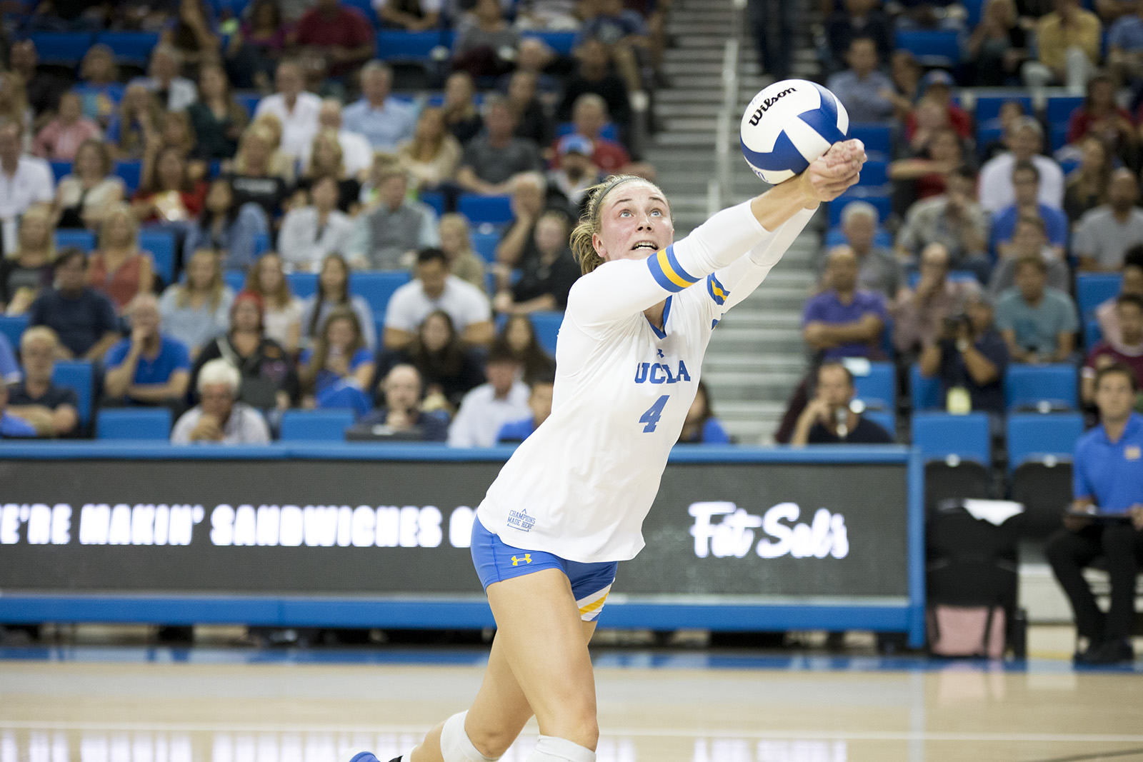 Photo: Senior outside hitter Reily Buechler had 16 kills, five block assists and seven digs in UCLA’s four-set win over Arizona. (Amy Dixon/Assistant Photo editor)