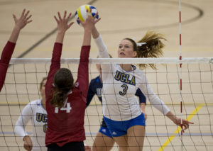 Photo: Torrey Van Winden led the Bruins with 16 kills Sunday, but the freshman opposite’s career-high performance wasn’t enough to carry UCLA to a victory. Arizona took the match in five sets. (Jennifer Hu/Daily Bruin staff)